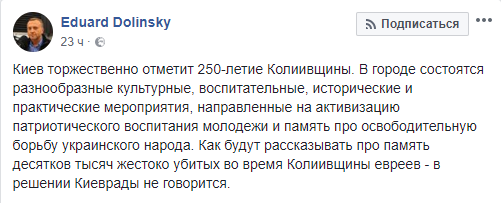 "Как будут рассказывать про память десятков тысяч жестоко убитых во время Колиивщины евреев - в решении Киеврады не говорится", - пишет Долинский.