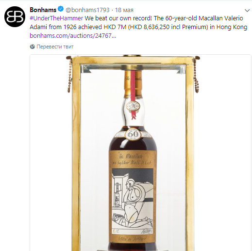 На аукционе торгового дома Bonhams в Гонконге бутылку 60-летнего шотландского виски Macallan продали за $1,1 млн. Это стало рекордом для виски, проданного на торгах.