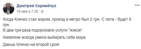 А вот политолог Дмитрий Корнейчук связывает подорожание проезда с пребыванием Кличко на посту мэра: "Когда Кличко стал мэром, проезд в метро был 2 грн. С лета - будет 8 грн. В два-три раза подорожали услуги "жэков". Киевляне всегда умели выбирать себе мэра. Даешь Кличко на второй срок!"