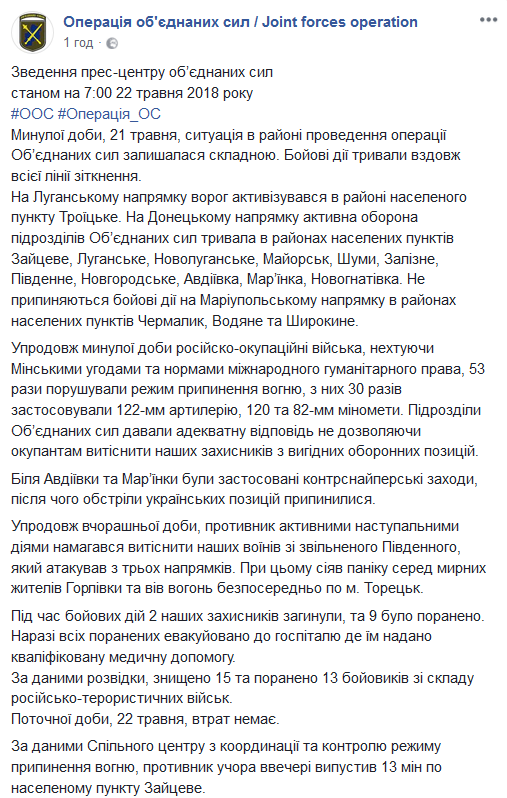 В зоне проведения ООС на Донбассе не стихают ожесточенные бои. За минувшие сутки, 21 мая, силы ВСУ потеряли двух бойцов убитыми. Еще девять украинских солдат ранены.