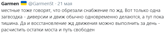 "Местные тоже говорят, что обрезали снабжение по жд. Вот только одна загвоздка – диверсии и движ обычно одновременно делаются, а тут пока тишина. Да и восстановление жд-движения можно выполнить за день – расчистить остатки моста и путь свободен", – пишет в Twitter пользователь с украинским флагом у аватарки.