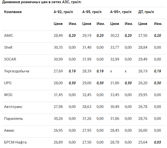 В частности, на 0,30 грн./л подорожали все виды топлива на заправках UPG: А-92 – до 28,00 грн/л, А-95 – до 29,00 грн/л, А-95+ – до 31,80 грн/л, ДТ – до 26,20 грн/л. В сети AMIC бензины и дизельное топливо подорожали на 0,20 грн/л.