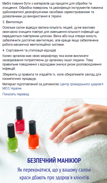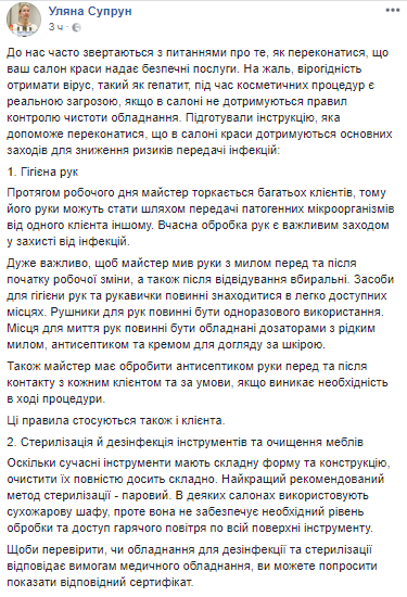 "К нам часто обращаются с вопросами о том, как убедиться, что ваш салон красоты предоставляет безопасные услуги. К сожалению, вероятность получить вирус, такой как гепатит, во время косметических процедур является реальной угрозой, если в салоне не соблюдают правила контроля чистоты оборудования" , - написала глава Минздрава.
