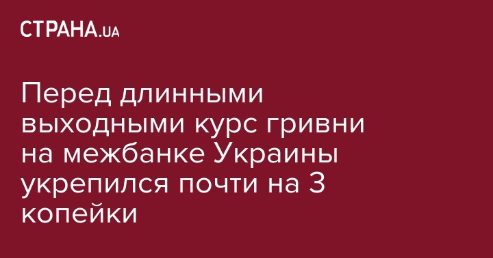Курс гривни на межбанковском валютном рынке в пятницу укрепился до 26,125 грн/$1 с 26,14 грн/$1 в предыдущий рабочий день, сообщили агентству "Интерфакс-Украина" дилеры коммерческих банков.