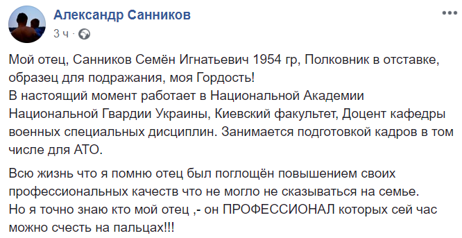 "Мой отец, Санников Семён Игнатьевич 1954 гр, полковник в отставке ... В настоящий момент работает в Национальной академии Национальной гвардии Украины, Киевский факультет, доцент кафедры военных специальных дисциплин. Занимается подготовкой кадров в том числе для АТО", – написал Санников-младший в Facebook.