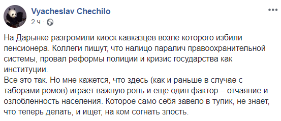 Все это так. Но мне кажется, что здесь (как и раньше в случае с таборами ромов) играет важную роль и еще один фактор – отчаяние и озлобленность населения. Которое само себя завело в тупик, не знает, что теперь делать, и ищет, на ком согнать злость", – пишет журналист Вячеслав Чечило.