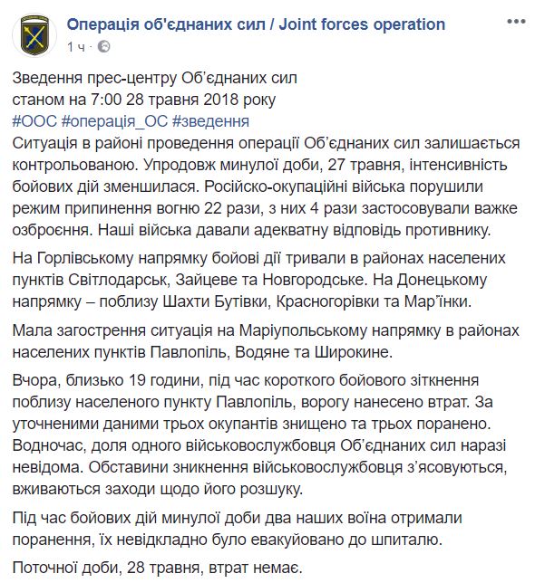 "Судьба одного военнослужащего Объединенных сил пока неизвестна. Обстоятельства исчезновения военнослужащего выясняются, принимаются меры по его розыску ", - подчеркнули в пресс-центре.