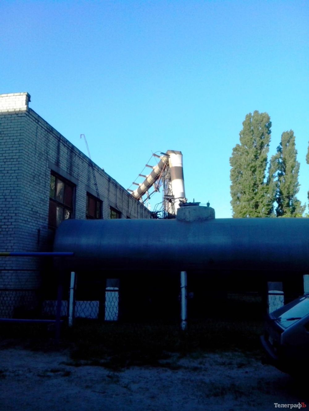 Труба завалилась на строение котельной. Никто из граждан не пострадал. Если бы упала на другой бок, то оказалась бы как раз на детской площадке. На верхушке упавшей трубы можно увидеть базовые станции мобильных операторов,  возможно, падение трубы приведет к ухудшению связи.