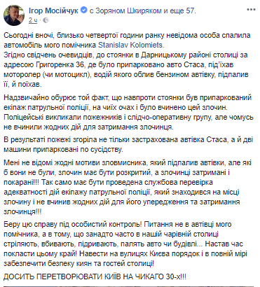 По словам очевидцев, к стоянке в Дарницком районе столицы по адресу Григоренко 36, где был припаркован автомобиль Стаса, подъехал мотороллер. Водитель облил бензином машину, поджег ее, и скрылся.