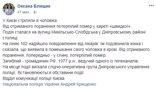 "На линию 102 поступило сообщение от врачей: им позвонила женщина и сказала, что обнаружила в доме своего мужа в крови. От полученного ранения, предварительно - в спину, пострадавший скончался", – сообщила начальник отдела коммуникаций полиции Киева Оксана Блищик в Facebook.