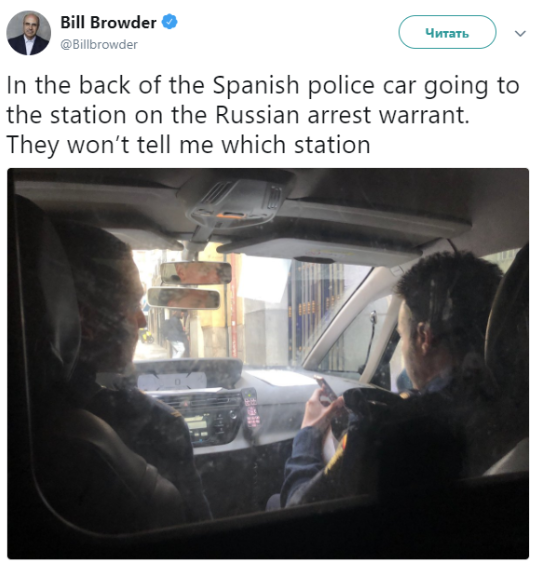 "Я на заднем сиденье машины испанской полиции, еду в отделение по российскому ордеру на арест. В какое отделение меня везут, мне не говорят", - написал Браудер.