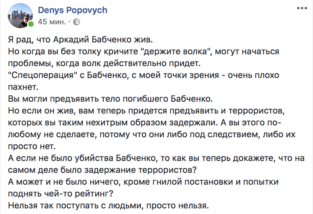 "Когда вы без толку кричите "держите волка", могут начаться проблемы, когда волк действительно придет. "Спецоперация" с Бабченко, с моей точки зрения - очень плохо пахнет. Вы могли предъявить тело погибшего Бабченко. Но если он жив, вам теперь придется предъявить и террористов, которых вы таким нехитрым образом задержали. А вы этого по-любому не сделаете, потому что они либо под следствием, либо их просто нет. А если не было убийства Бабченко, то как вы теперь докажете, что на самом деле было задержание террористов? А может и не было ничего, кроме гнилой постановки и попытки поднять чей-то рейтинг? Нельзя так поступать с людьми, просто нельзя", - пишет журналист Денис Попович.