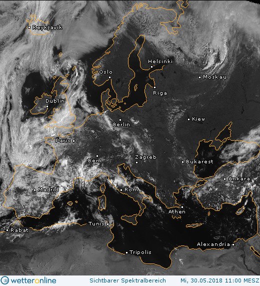 Сам фронт сейчас видно немного (на фото со спутника), фронтальная облачность вытянулась с северо-востока к Балтике.