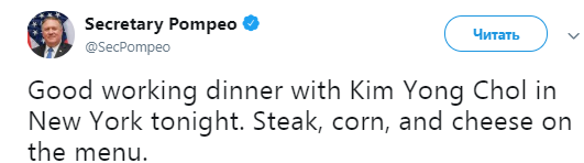 "Хороший рабочий обед прошел сегодня вечером с Ким Ен Чхолем в Нью-Йорке. В меню были стейк, кукуруза и сыр", - написал Помпео, не уточнив детали переговоров.