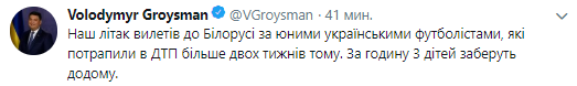"Наш самолет вылетел в Беларусь за юными украинскими футболистами, которые попали в ДТП более двух недель назад. Через час трех детей заберут домой", - говорится в сообщении.