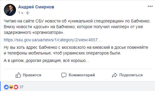 "Читаю на сайте СБУ новости об "уникальной спецоперации" по Бабченко. Внизу новости "досье" на Бабченко, которое получил "киллер" от уже задержанного "организатора". Ну вы хоть адрес Бабченко с московского на киевский в досье поменяйте и телефоны мобильные, чтоб украинских операторов были. А в целом, дорогая редакция, все хорошо...", - написал Смирнов.