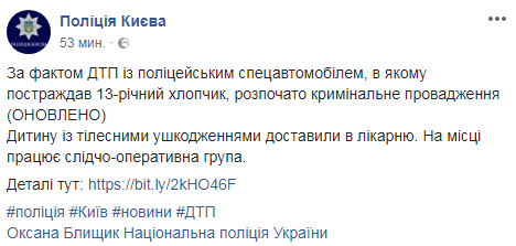 "По факту ДТП с полицейским спецавтомобилем, в котором пострадал двенадцатилетний мальчик, начато уголовное производство. Ребенок с телесными повреждениями госпитализирован. На месте работает следственно оперативная группа", - говорится в сообщении.
