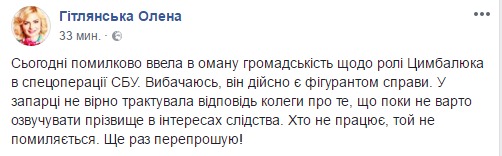 "Сегодня ошибочно ввела в заблуждение общественность о роли Цымбалюка в спецоперации СБУ. Извиняюсь, он действительно является фигурантом дела. В запарке неверно трактовала ответ коллеги о том, что пока не стоит озвучивать фамилию в интересах следствия. Кто не работает, тот не ошибается. Еще раз извиняюсь!" – написала она.