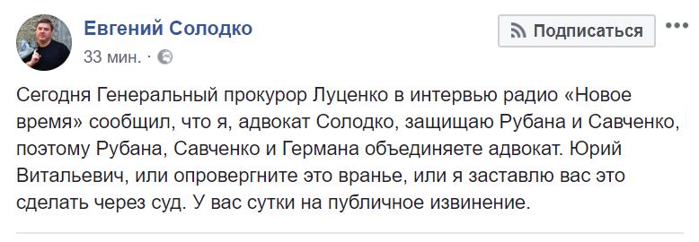 "Генеральный прокурор Луценко в интервью радио "Новое время" сообщил, что я, адвокат Солодко, защищаю Рубана и Савченко, поэтому Рубана, Савченко и Германа объединяете адвокат. Юрий Витальевич, или опровергните это вранье, или я заставлю вас это сделать через суд. У вас сутки на публичное извинение", - написал Евгений Солодко.