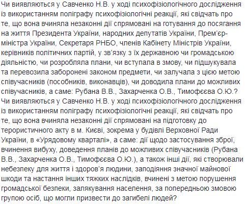 "Савченко Н.В. обсуждала с сообщниками планы убийства руководителей государства, в частности лично распределяла роли в покушениях. Ею был разработан четкий план убийства руководителей государства, она договаривалась с сообщниками, кто и что должен делать во время покушения на убийство руководителей государства. Свои планы она доводила до Тимофеева А.Ю. и Рубана В.В. Полиграф также показал, что Савченко готовилась осуществить теракт в "Правительственном квартале" и здания Верховной Рады", - говорится в сообщении СБУ.