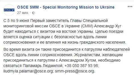 Первый заместитель главы Специальной мониторинговой миссии ОБСЕ в Украине (СММ ОБСЕ) Александр Хуг посетит Донбасс с 5 до 9 июня.