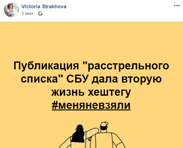 "Публикация "расстрельного списка" СБУ дала вторую жизнь хештегу #меняневзяли", - пишет банкир Виктория Страхова.
