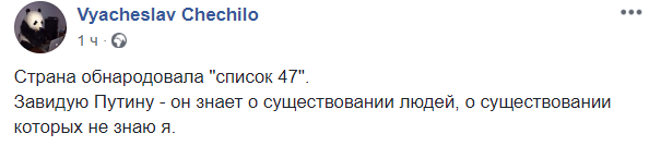 "Страна обнародовала "список 47". Завидую Путину - он знает о существовании людей, о существовании которых не знаю я", - иронизирует журналист Вячеслав Чечило.