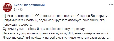 Вечером 5 июня на перекрестке Оболонского проспекта и Степана Бандеры, в направлении ж/м Оболонь, водитель маршрутного автобуса сбил женщину, которая переходила дорогу.