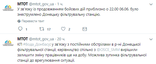 Также МинВот отмечает, что вчера КП Вода Донбаса: в связи с постоянными обстрелами в районе Донецкой фильтровальной станции совместно с СММ ОБСЕ решило оставить смену работников еще на сутки.