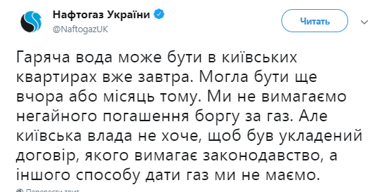"Горячая вода может быть в киевских квартирах уже завтра. Могла быть еще вчера или месяц назад. Мы не требуем немедленного погашения долга за газ. Но киевская власть не хочет, чтобы был заключен договор, которого требует законодательство, а другого способа дать газ у нас нет!, - говорится в сообщении.