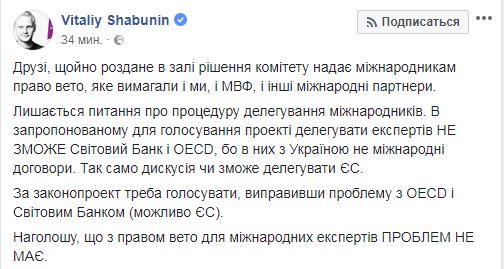 "Друзья, только розданное в зале решение комитета предоставляет международников право вето, которое требовали и мы, и МВФ, и другие международные партнеры", - написал он.