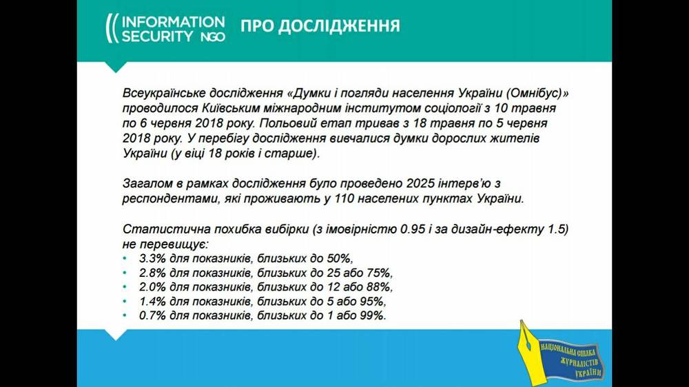 Всеукраинское исследование "Мнения и взгляды населения Украины (Омнибус)" провел Киевский международный институт социологии с 10 мая по 6 июня 2018 (полевой этап длился с 18 мая по 5 июня) - изучались мнения взрослых жителей Украины в возрасте 18 лет. Всего в рамках исследования проведены 2025 интервью с жителями 110 населенных пунктов Украины.