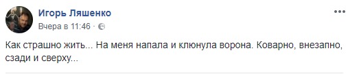 "Как страшно жить... На меня напала и клюнула ворона. Коварно, внезапно, сзади и сверху", - сообщил 7 июня Игорь Ляшенко.