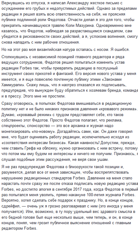Столкнувшись с независимой позицией главного редактора и ряда ведущих сотрудников, Федотов решил попытаться изменить устав редакции Forbes так, чтобы превратить редакцию в послушный инструмент своих прихотей и фантазий. Его версия нового устава у меня имеется, и я еще повеселю почтенную публику этими "Законами Хаммурапи". Скажу лишь, что я наотрез отказался их подписывать, предупредив, что вынужден буду обратиться к хозяевам бренда, команде и в прессу. Этого мне не простили.