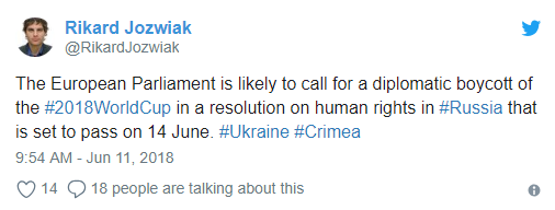 "Европейский парламент, скорее всего, призовет к дипломатическому бойкоту чемпионата мира-2018 в резолюции по правам человека в России, которую должен одобрить 14 июня", - написал журналист.