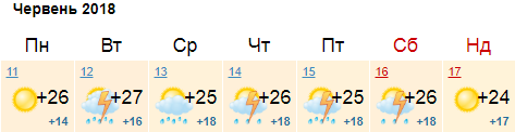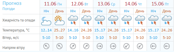 Ресурс Мeteoprog.ua прогнозирует грозы 12 и 13 июня. В среду днем +20, в остальные дни недели до +25...+26.