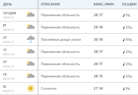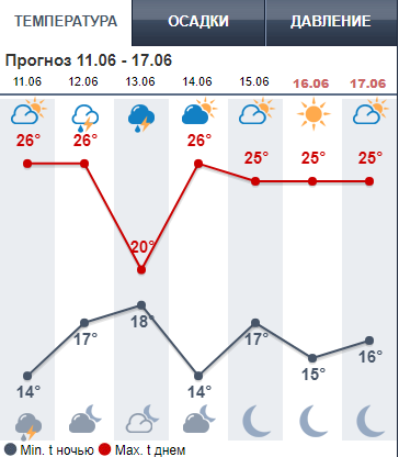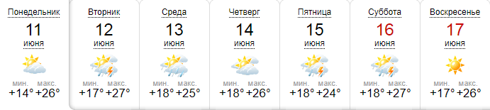 Сайт Gismeteо прогнозирует грозовые дожди со вторника по субботу включительно. В воскресенье обещают солнце. Днем +25...+27. В воскресенье, 17 июня, до +24.