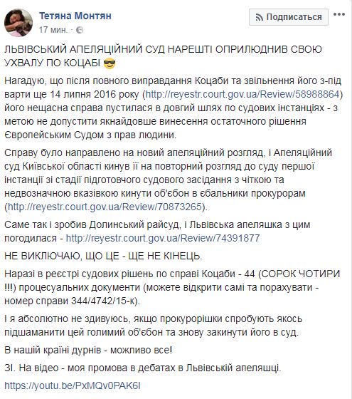 В то же время, Монтян не исключает, что это еще не конец. "Сейчас в реестре судебных решений по делу Коцабы - 44 (сорок четыре!!!) процессуальных документа", - сообщает она и  отмечает, что эти дела прокуроры могут отправить в суд.
