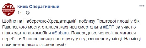 Под колесами Subaru в Киеве погиб мужчина, который попробовал перебежать шесть полос дороги