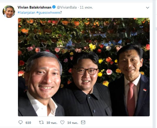 Затем Ким Чен Ын вместе с министром иностранных дел Сингапура Вивианом Балакришнан остановился на "Юбилейном мосту" в парке "Мерлиона", и тот достал свой телефон и сделал с лидером КНДР селфи, которое потом выложил в свой Twitter.