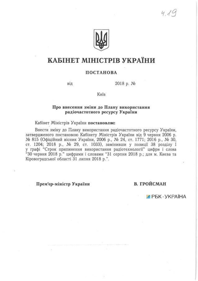 В частности, согласно пояснительной записке, для своевременного выполнения задач, связанных с защитой национального телерадиоинформационного пространства, улучшения состояния покрытия территорий цифровым вещанием и обеспечения слабозащищенных слоев населения преобразователями цифрового сигнала предлагается установить конечную дату отключения аналогового вещания 31 августа 2018 года, а для Киева и Кировоградской области - 31 июля 2018.