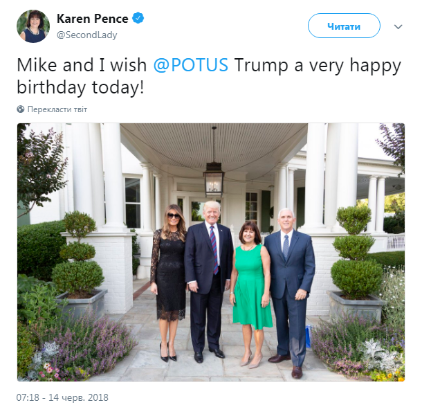 Жена вице-президента США Майка Пенса, "вторая леди" - Карен пожелала Дональду Траму от себя и от мужа - очень счастливого Дня рождения.