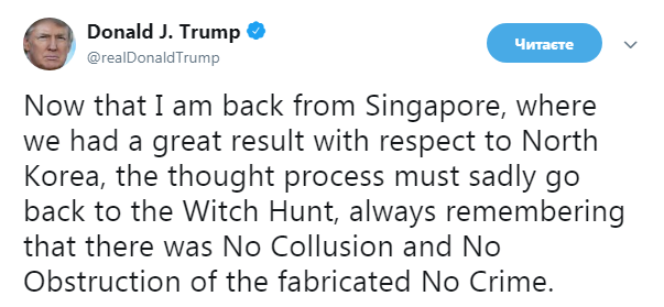 "Теперь, когда я вернулся из Сингапура, где мы достигли отличного результата в отношении Северной Кореи, должен с грустью вернуться к "Охоте на ведьм", всегда помня о том, что не было никакого сговора и никаких помех (расследованию - Прим.Ред.) сфабрикованного Не преступления