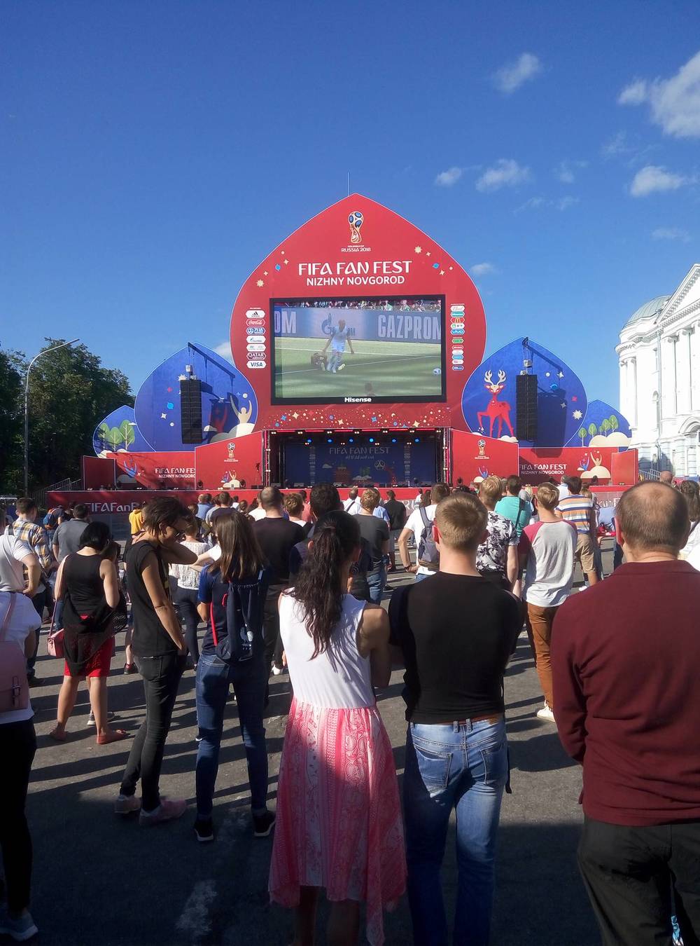 17:10 В фан-зоне в Нижнем Новгороде болельщики наблюдают за поединком Аргентины и Исландии.
