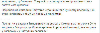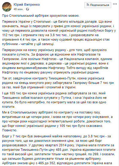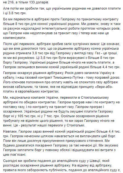 "Мы сделали представление в Апелляционный суд в Швеции, который рассматривает обжалования решения арбитража. В отличие от арбитража, правила которого запрещают публичность, представление в Апелляционный суд является, как правило, публичными. Поэтому все желающие могут его прочитать - там есть много чего интересного! Национальная компания Нафтогаз Украины выигрывает и в этом поединке. Он будет непростым и поэтому мы просим поддержки", - написал Юрий Витренко.