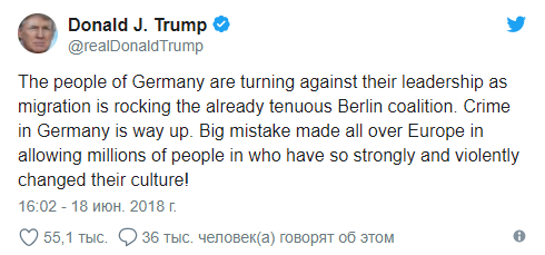 "Народ Германии поворачивается против своих лидеров, в то время как миграция раскачивает и без того хрупкую берлинскую коалицию. Преступность в Германии высокая. Большая ошибка была сделана по всей Европе - пустить к себе миллион людей, которые так сильно и жестоко изменили их культуру!", - подчеркнул Трамп.