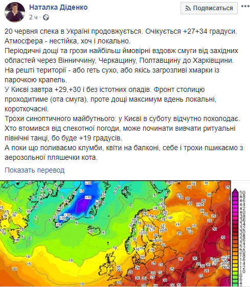 По ее данным, 20 июня жара в Украине продолжится. Ожидается +27...+ 34. Периодические дожди и грозы наиболее вероятные вдоль полосы от западных областей через Винницкую, Черкасскую, Полтавскую область к Харьковской.