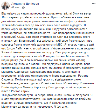 Уполномоченный по правам человека в Украине Людмила Денисова заявила про срыв одновременного посещения политзаключенных с коллегой Татьяной Москальковой режиссера Олега Сенцова в Салехарде и журналиста Кирилла Вышинского в Херсоне. Таким образом, намечены новые переговоры омбудсменов Украины и России.