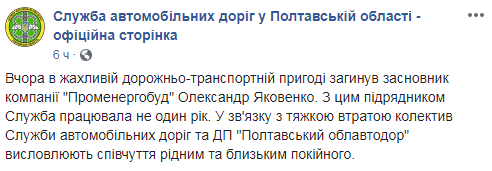 "Вчера в ужасном дорожно-транспортном происшествии погиб основатель компании Промэнергострой Александр Яковенко. С этим подрядчиком Служба работала не один год", – говорится в сообщении автодора на странице в Facebook.