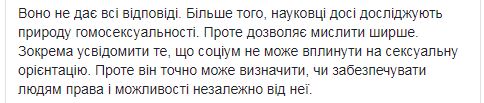 Она добавила, что во второй половине прошлого века ученые провели ряд исследований и пришли к выводу, что гомосексуальность не является болезнью. "Гомосексуальное поведение встречается у 1500 видов животных - от насекомых до млекопитающих, а сексуальная ориентация человека формируется не за ее образ жизни, окружение или характер, а еще до ее рождения", - отметила она.